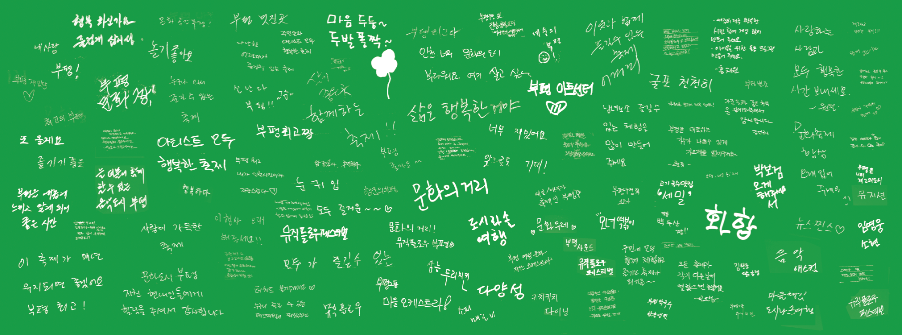 안녕하세요. 여러분, 문화도시부평입니다. 제가 파리 여행 중에 몽마르뜨에서 '사랑해 벽'이라는 걸 보게되었어요. 250개의 언어로 311개의 '사랑해'라는 단어가 가득 적혀있었어요. 한국인으로서 한글 '사랑해' 앞에서 사진도 찍고 감격도 했던 기억이 납니다. 이번에 문화도시부평 <시민 공론장>을 준비하면서 문화두레시민운영회와 함께 '부평해'벽을 만들었어요! 3년 간 문화도시부평의 다양한 행사에서 시민 여러분의 글귀를 모았었는데요. 이 벽을 준비하면서 각자가 감각하는 부평에 대해 알 수 있는 시간이 되기도 했습니다.