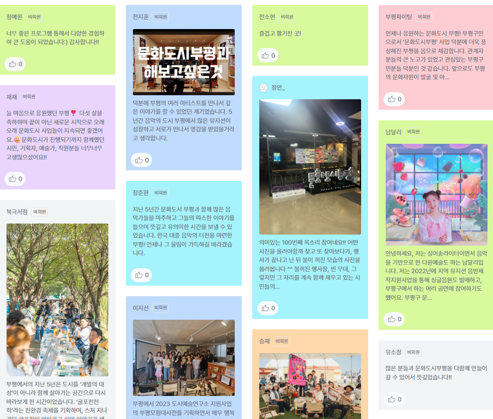 현재 사회적협동조합 빠띠와 함께 문화도시부평 5년의 목소리를 모으고 있어요. 문화도시부평과 함께했던 모든 분들 좋은 글 남겨주시면 감사하겠습니다. 벌써 100명이 넘는 시민, 예술가, 기획자, 문화공간 운영자, 직원 분들이 작성해주셨는데요. 뭔가 각자 문화도시부평에 대한 애틋함을 확인하는 시간이 되고 있어요. 위 링크를 눌러서 다양한 분들의 이야기 확인해보셔도 좋을 것 같습니다!