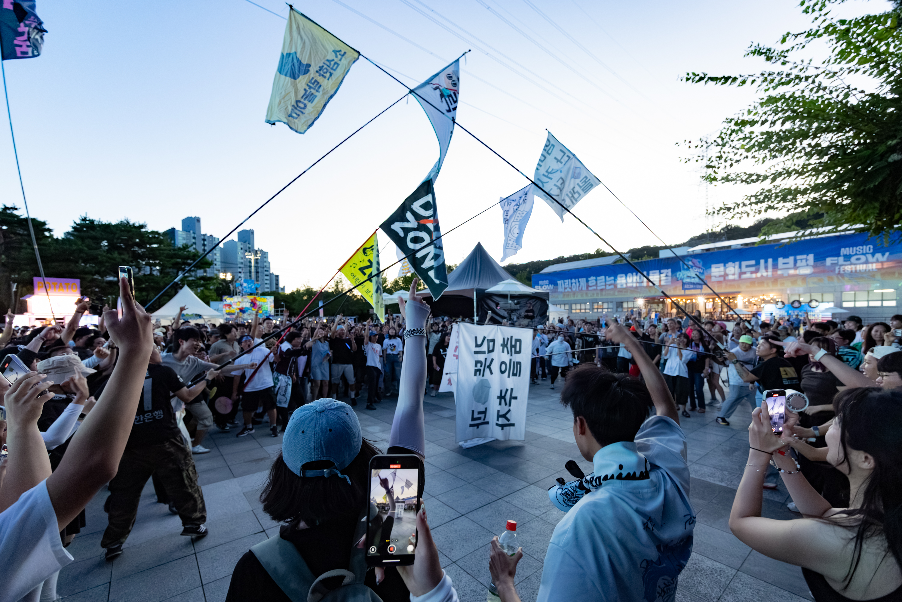 지혜 올해 열린 <뮤직 플로우 페스티벌>이 가장 기억에 남아요. 다른 대형 페스티벌에 비하면 작은 동네 축제인데도 라인업을 공개했을 때부터 시민들의 관심이 이전에 비해 확실히 높아졌다는 걸 느꼈어요. 행사 당일에는 일찍부터 기다리는 시민도 많이 있었고, 페스티벌의 상징처럼 자리잡은 깃발부대와 슬램을 하는 관객들도 많이 볼 수 있었어요. 현장 분위기가 훨씬 활기차고 페스티벌다운 느낌이 들었어요.